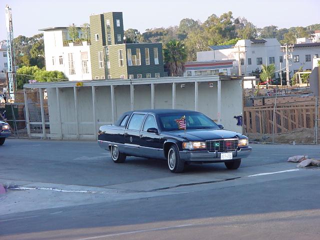 Clinton's limo leaves for dinner. I missed photographing the creep through the passenger side window as he passed. He waved to the crowd...while the digital camera was recovering for next shot. |