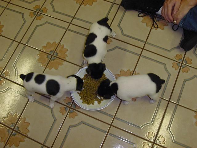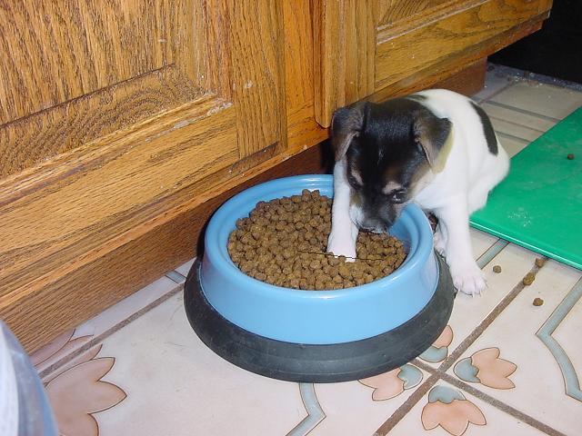 Boy pup #2 checks out the food bowl, December 26, 2002
