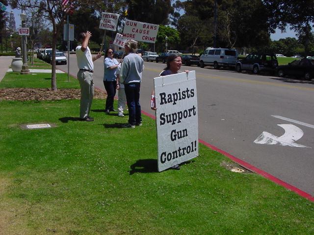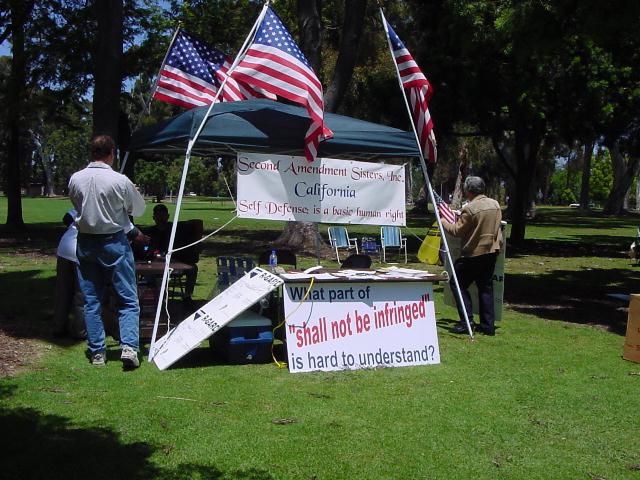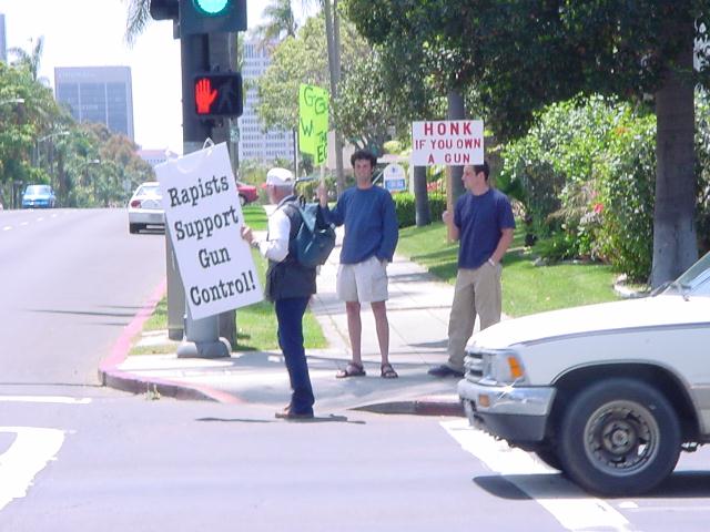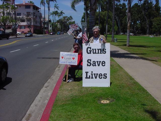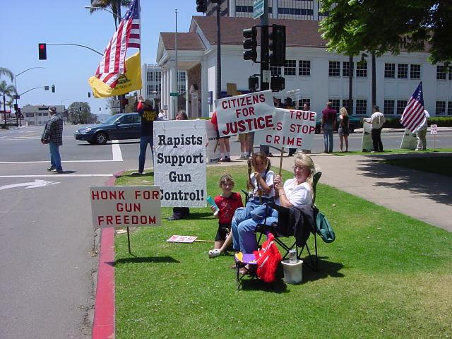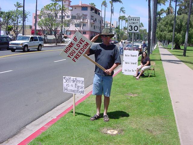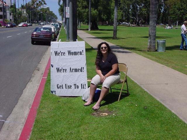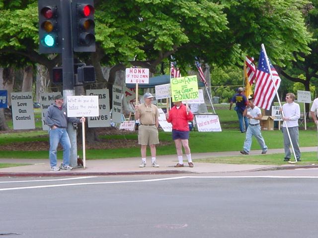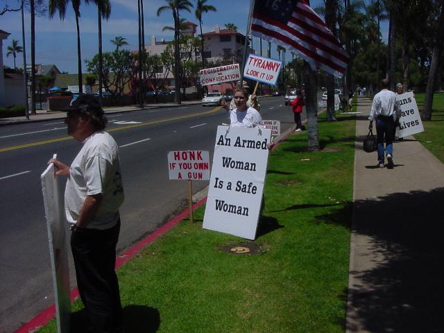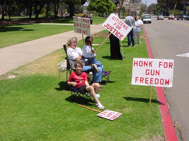 The San Diego Second Amendment Sisters/Armed Informed Mothers (SAS/AIM) was joined by the San Diego members of the Tyranny Response Team in Balboa Park on Mother's Day 2001. Our ranks were sparse but spirited. The signs encouraging passing drivers to "Honk if you own a gun" or "Honk if you love freedom" kept the air alive with honking horns. Most cars passing through the intersection offered support. As expected, we also received a few "thumbs down" and "finger up" greetings from detractors. It was a pleasant day to acquire a sunburn and educate a few more curious citizens.