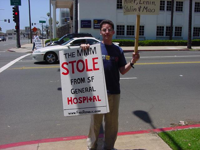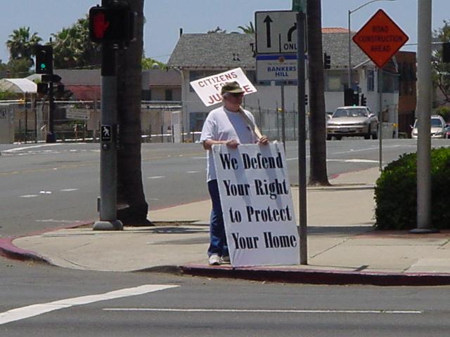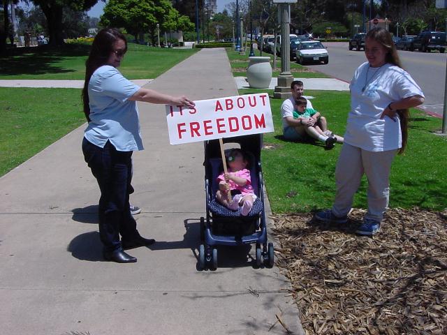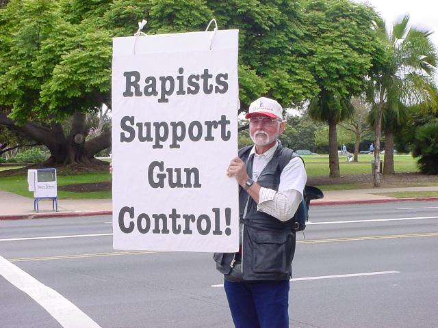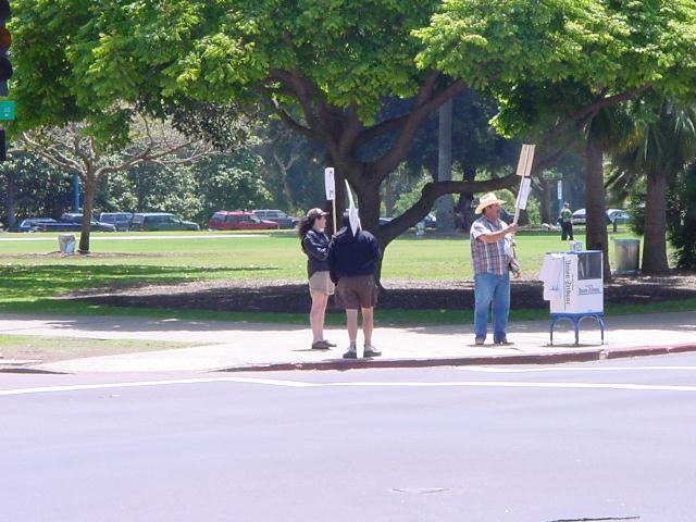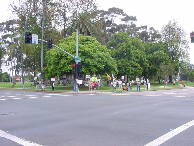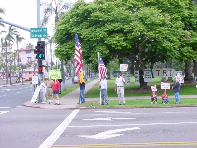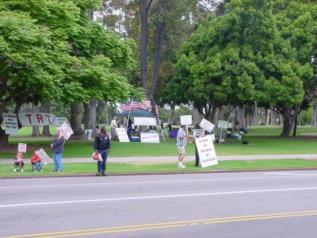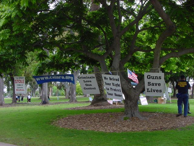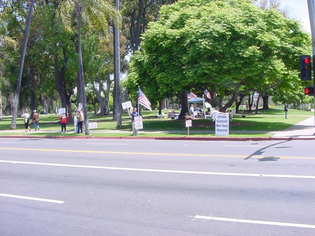 The San Diego Second Amendment Sisters/Armed Informed Mothers (SAS/AIM) was joined by the San Diego members of the Tyranny Response Team in Balboa Park on Mother's Day 2001. Our ranks were sparse but spirited. The signs encouraging passing drivers to "Honk if you own a gun" or "Honk if you love freedom" kept the air alive with honking horns. Most cars passing through the intersection offered support. As expected, we also received a few "thumbs down" and "finger up" greetings from detractors. It was a pleasant day to acquire a sunburn and educate a few more curious citizens.